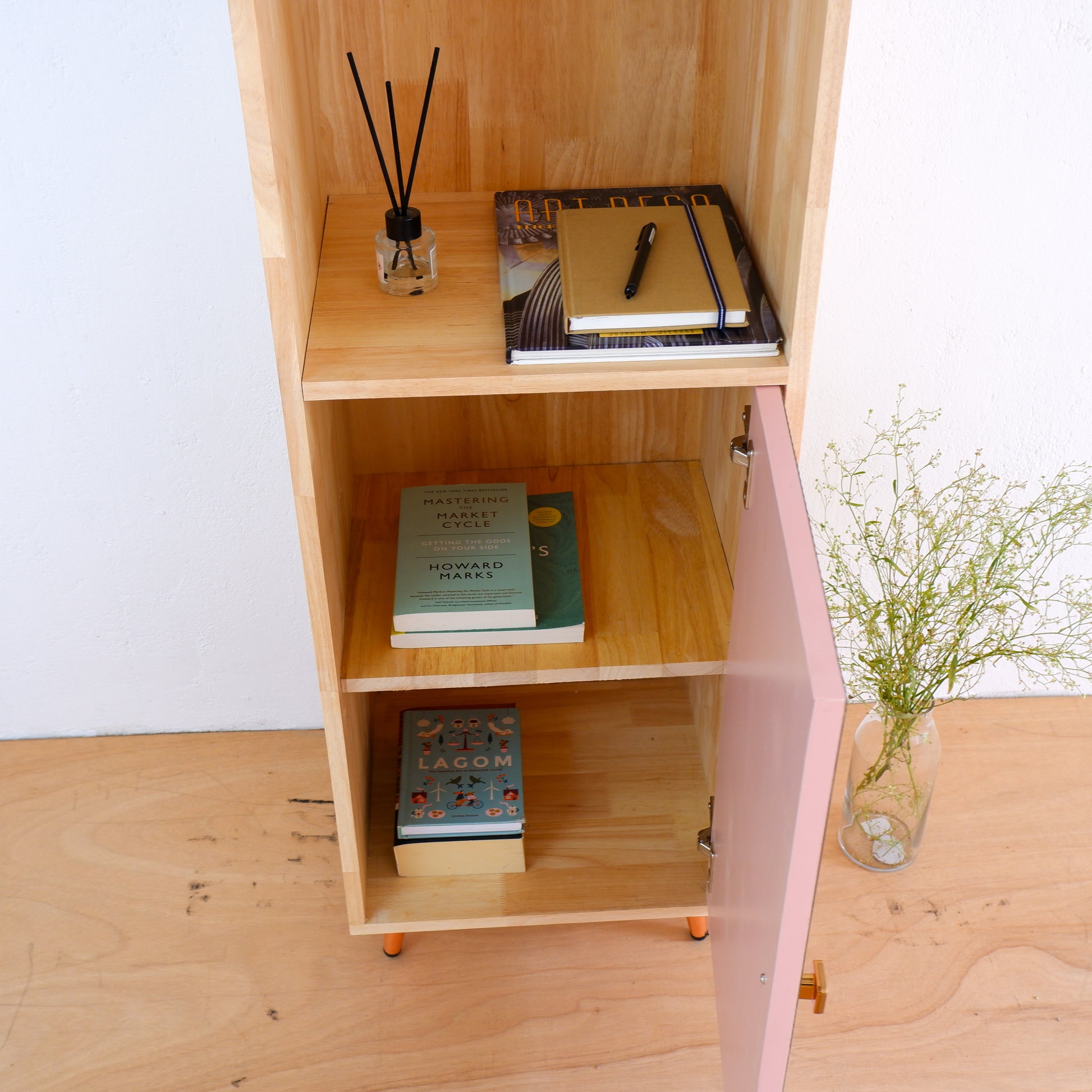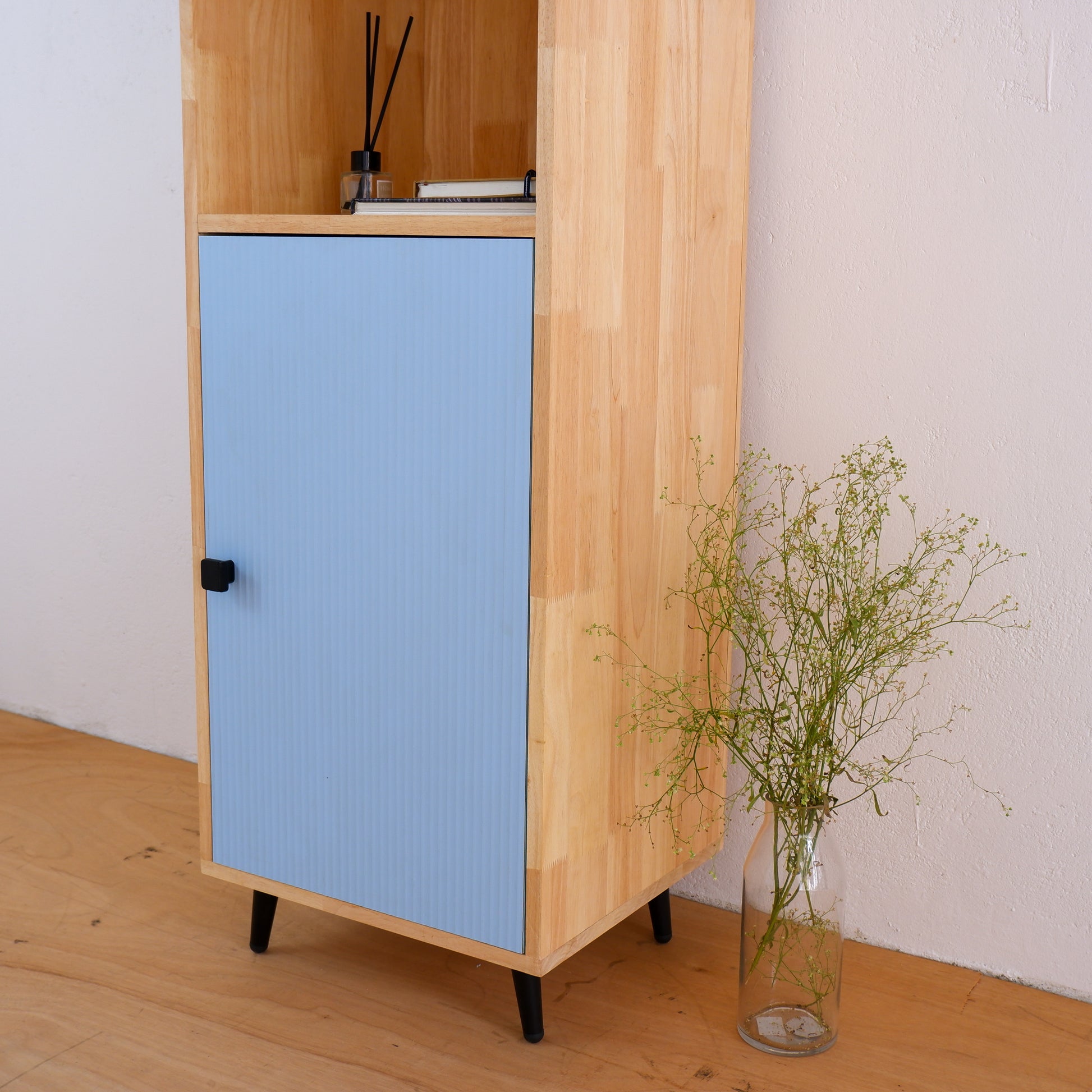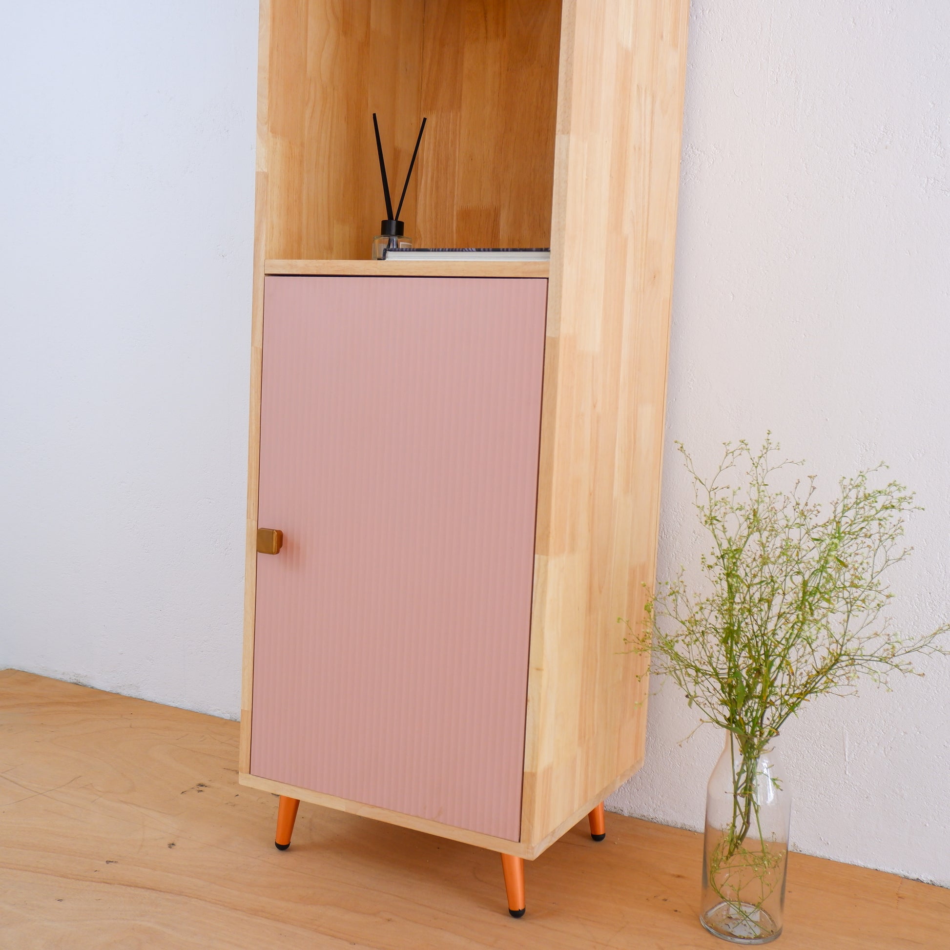 Add a pop of color and style to your home with this handcrafted mid-century modern bookshelf and display cabinet by Woodwala. Made from high-quality solid wood, this versatile unit features a grooved laminated door in a soft pastel finish, rose gold metal knob, and sleek matching legs—perfect for adding charm to any room.